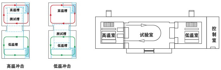 兩廂設(shè)備區(qū)分為高溫區(qū)、低溫區(qū)、試驗(yàn)區(qū)三部分,測(cè)試產(chǎn)品置于測(cè)試區(qū),沖擊時(shí)高溫區(qū)或低溫區(qū)的溫度進(jìn)入測(cè)試區(qū)進(jìn)行沖擊,測(cè)試產(chǎn)品為靜態(tài)式。